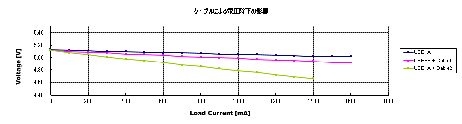 USB-A+Cable2はACアダプタに普通に市販されている一般的なUSBケーブルを接続した場合の計測結果です。