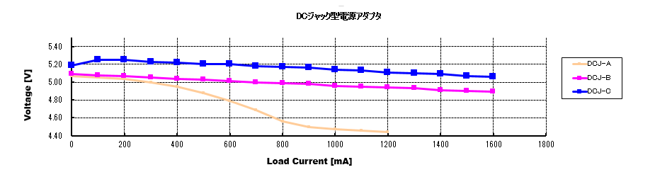 比較的新しいDCJ-BとDCJ-Cは負荷が大きくなるのに比例して電圧は低下してきます。特に最新のDCJ-Cでは定格2.0Aの80%でも5.0V以上を維持しています。