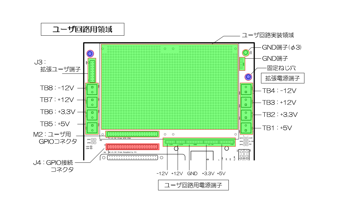 ・ユーザが回路を増設する際に必要な電源を供給する端子です。GND、+5V、+3.3V、+12V、-12V用の端子があります。