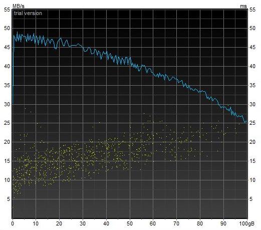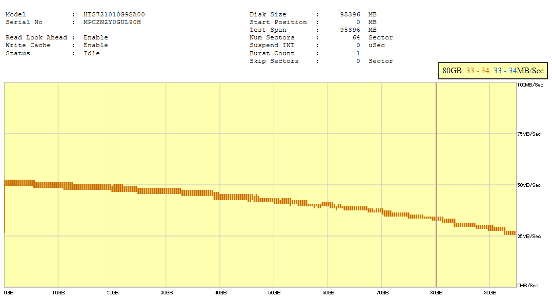 HDDの書込み若しくは読出しアクセスの能力をデータ転送能力(一般的にはMB/secで表示)で表し、グラフ上の縦軸に割当てます。横軸はHDD記録ディスクの論理的な記録位置です。一般的には、HDDの全領域若しくは一部の領域をシーケンシャルにアクセスしながらその記録位置のアクセス性能をプロットしてグラフを作成します。