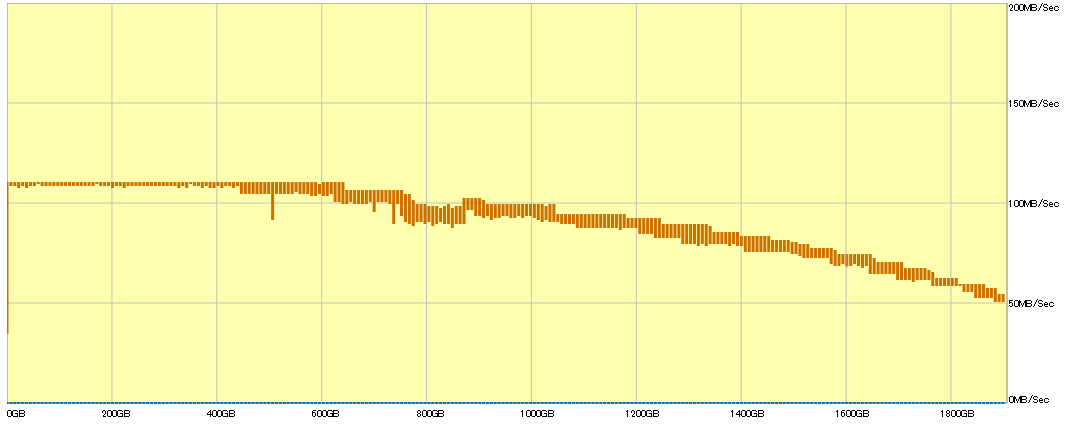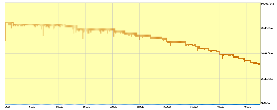 HDDではディスクの外周と内周では速度差があり、外周の方が性能が高く、外周から内周に向かってアクセスが進行するにつれ、性能は低下します。