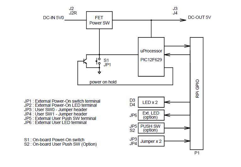 Raspberry PiのGPIOをユーザ用のLED制御、ユーザ用のPUSH SW、ジャンパ設定読込として使用することが可能です。2)
