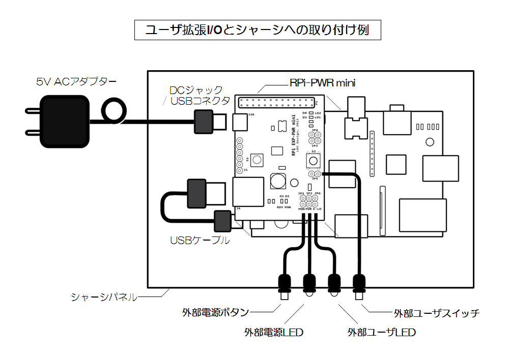 (1)User LEDはRPi-PWRボードに実装されたLEDです。Raspberry Piのプログラム中やシェルスクリプトで簡単にON/OFFさせることが可能です。