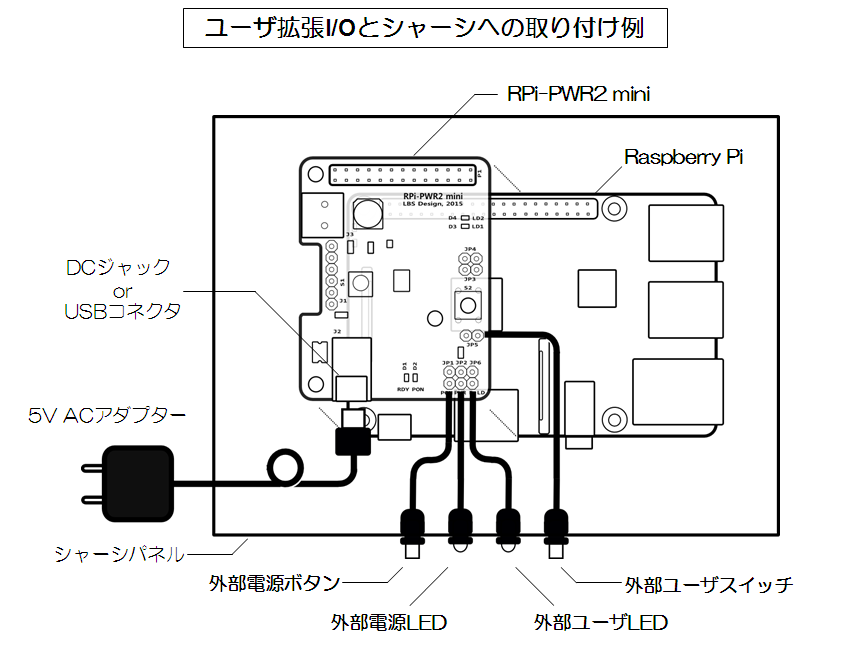 (1)User LEDはRPi-PWR2 miniボードに実装されたLEDです。Raspberry Piのプログラム中やシェルスクリプトで簡単にON/OFFさせることが可能です。