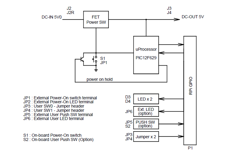 Raspberry PiのGPIOをユーザ用のLED制御、ユーザ用のPUSH SW、ジャンパ設定読込として使用することが可能です。2)