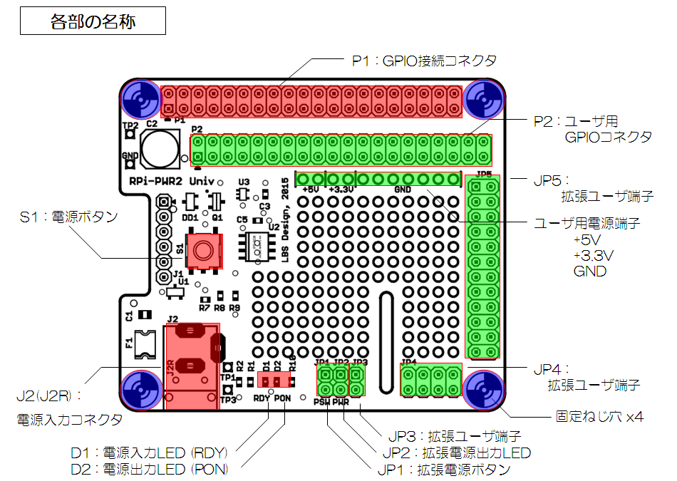 | D2 | 電源出力LED | ✓ | PON : Raspberry Piに電源供給時に点灯 |